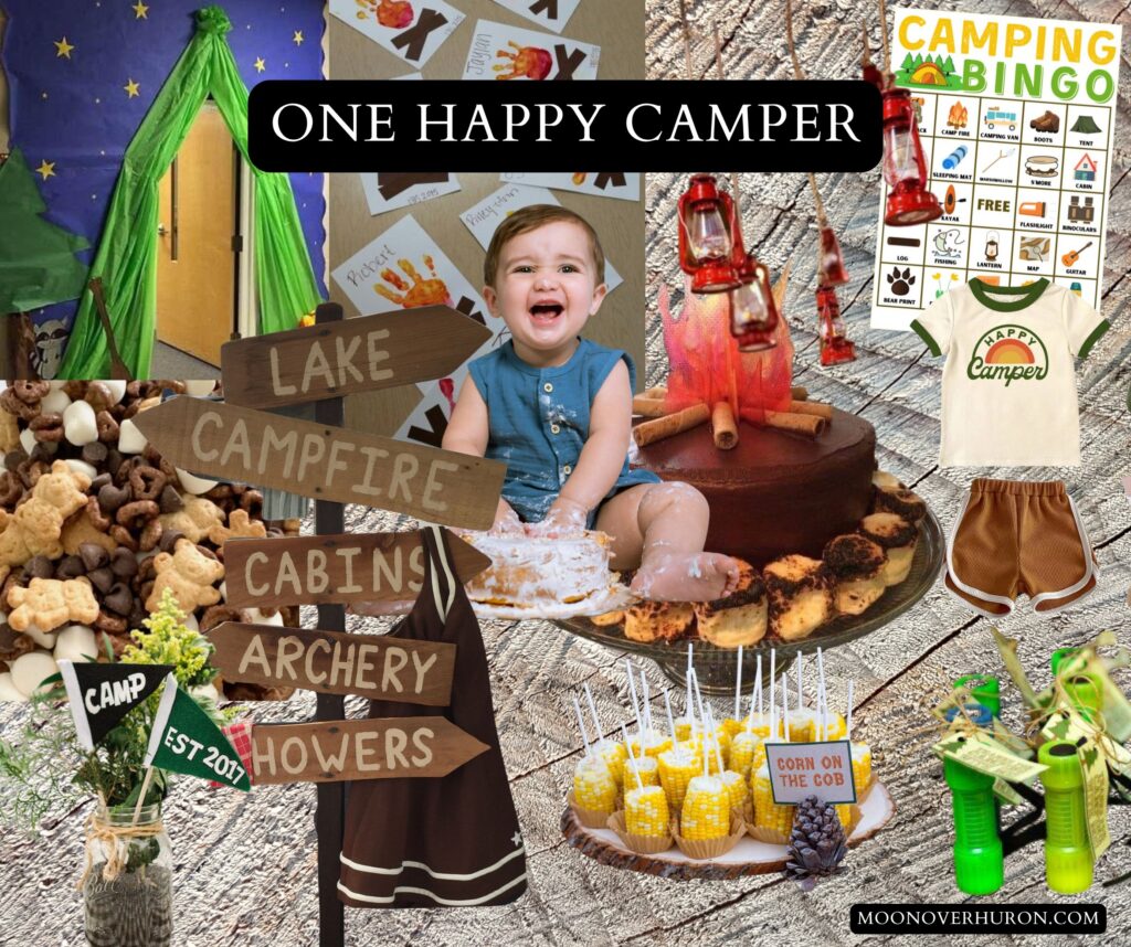 Tents, trees, lanterns, and rustic wood accents. Add faux campfires and cozy blankets.