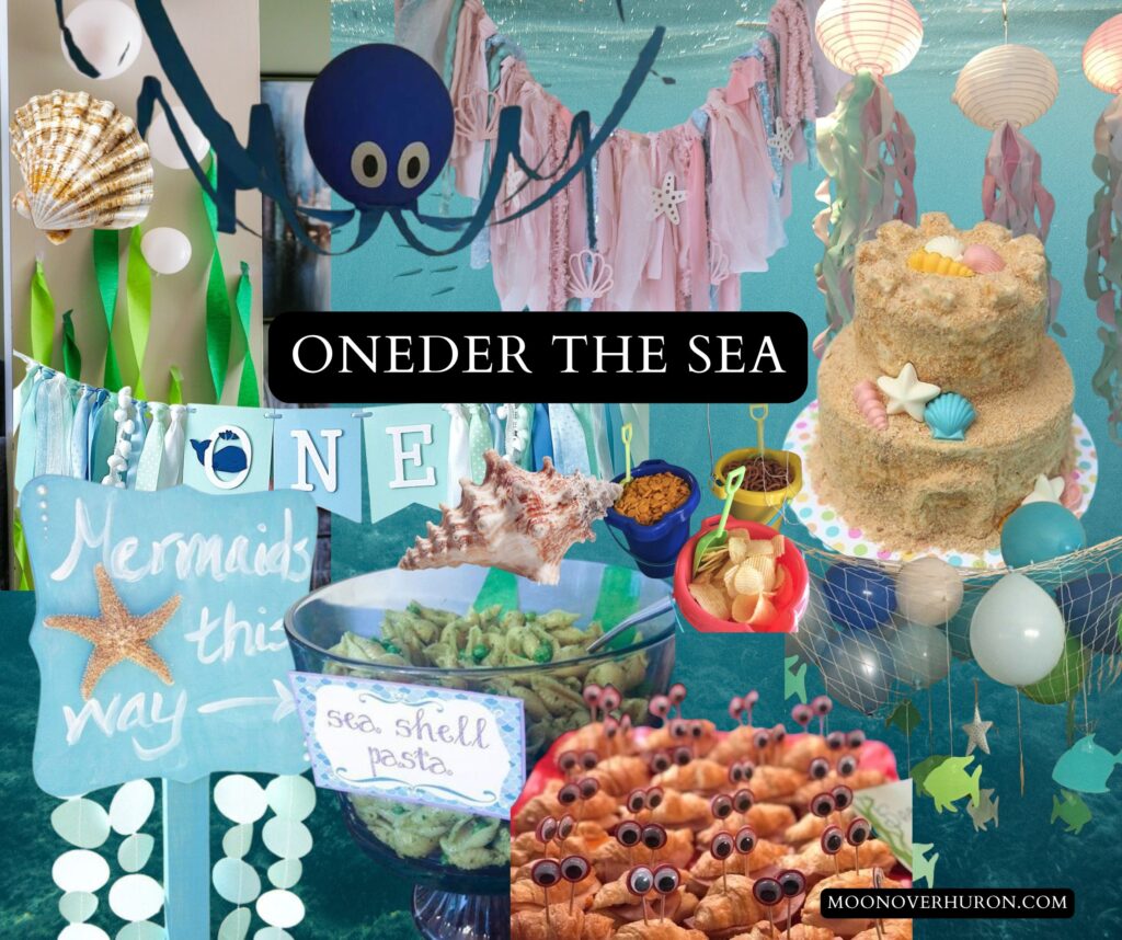 Blues, teals, balloons, sea creatures, and streamers for waves.